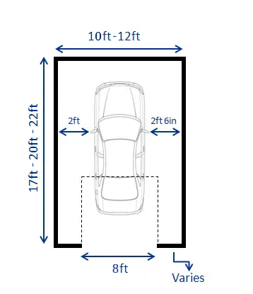 For a hatchback, a small garage with dimensions of 17 feet in length and 10 feet in width would be suitable. This size provides enough space for most hatchback cars, which typically have a maximum length of 13.1 ft. and width of 5.82 ft.